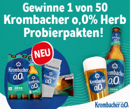 Wenn Sie beim Krombacher Gewinnspiel erfolgreich teilnehmen, können Sie sich vom Geschmack von Krombacher o,0 % Herb überzeugen. Verlost werden nämlich Probiersixpacks: Die Preise beim Krombacher-Gewinnspiel: 50 Probierpakete Krombacher o,0…